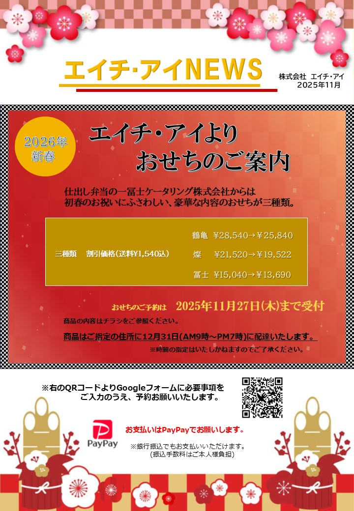 毎年大好評のおせちのご案内です。 有名百貨店でもお取り扱いのある商品を、兵庫医大教職員様に限り特別価格でお届けします!