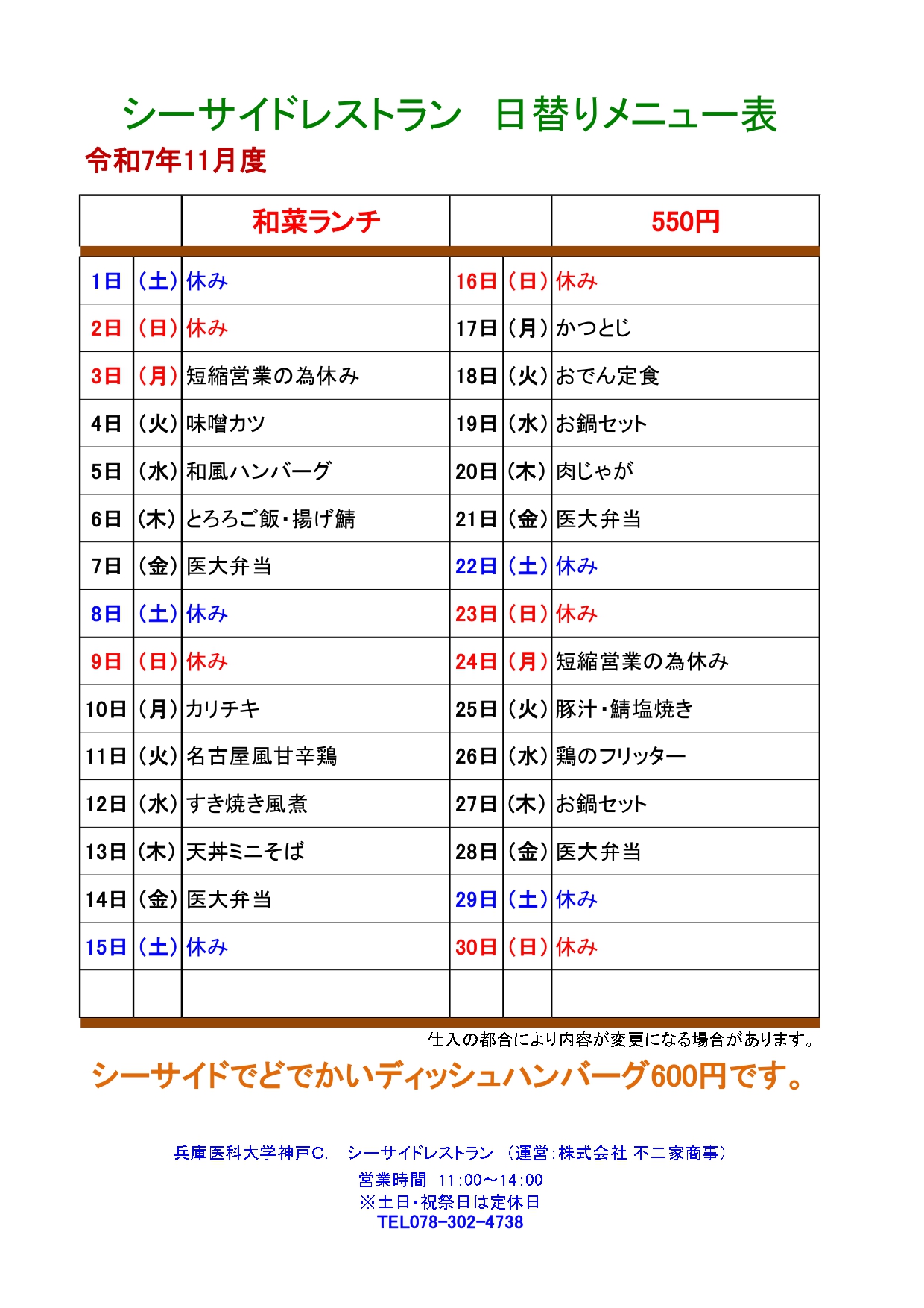 11月3日(月)、11月24日(月)は、短縮営業です。(営業時間 11:30~13:30)
