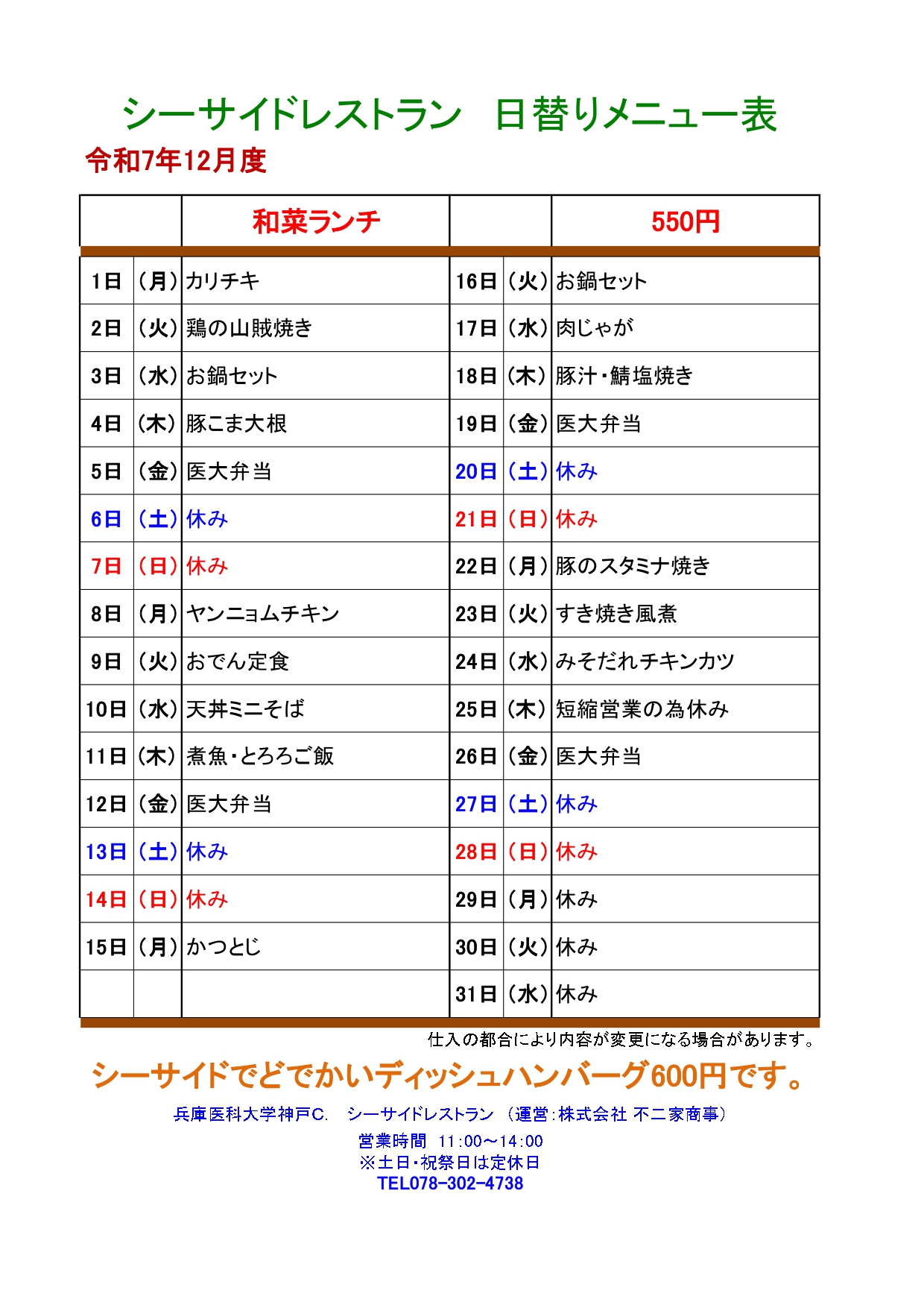 シーサイドレストランメニュー(12月)