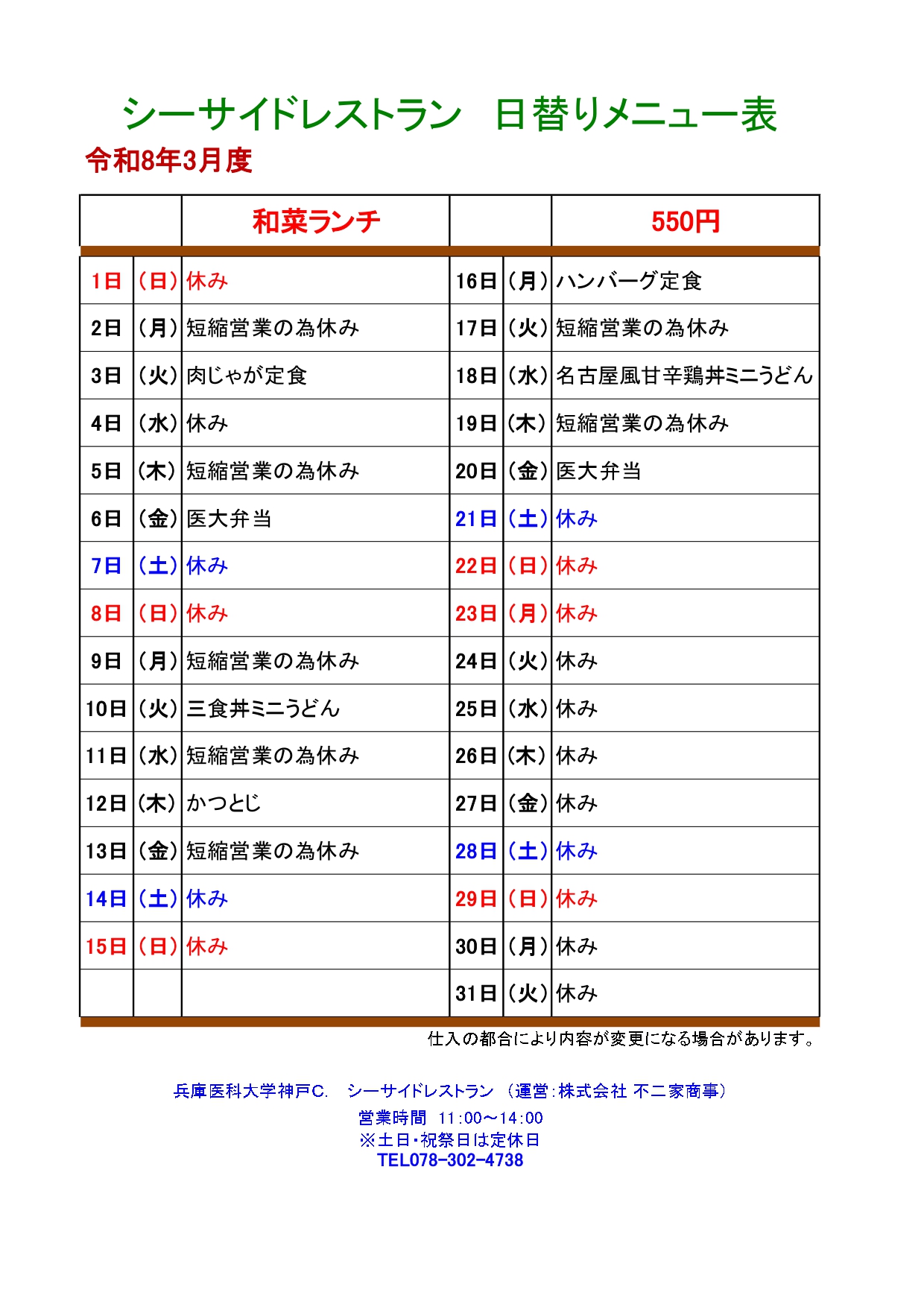 シーサイドレストランメニュー(3月)